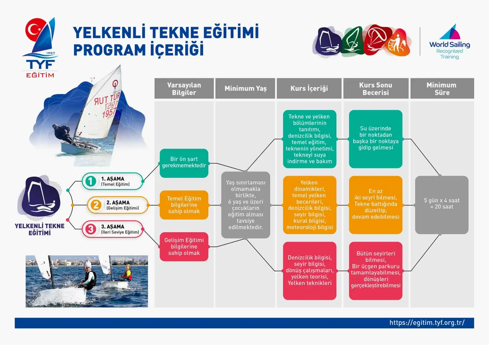 Beş haftalık bir dönemi tamamlayan çocuk temel seviye tekne donanımını, seyirleri ve manevraları uygulayabilir ve kullanılan denizcilik terimlerini anlayabilir hale gelmiş olur. Birden fazla kura devam eden çocuklar tekne hakimiyetlerini geliştirerek, denizde herhangi bir desteğe ihtiyaç duymadan güvenli seyir yapabilir hale gelebilirler.